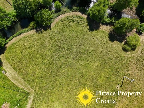 منزل ريفي مع أشجار الفاكهة وقطعة أرض بجانب مجرى مائي